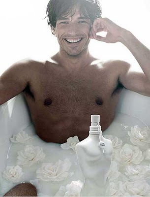 Z punktu widzenia walorów typowo użytkowych FdM to zapach niemal liniowy, pozbawiony spektakularnej ewolucji (poza przejściem z dominacji kwiatu pomarańczy do dominacji waniliowej kumaryny), o sporej projekcji i bardzo dobrej, kilkunastogodzinnej trwałości. To czy spodoba się mężczyźnie, oczywiście zależy od jego gustu, jednak by polubić FdM, trzeba z pewnością być osobą uciekającą od męskich stereotypów, lubiącą zapachowe wyzwania i niejednoznaczności. Łatwo bowiem tej – pięknej moim zdaniem – kompozycji przypiąć łatkę metroseksualnej, mało męskiej, mało samczej. Nie będzie to zresztą łatka nieprawdziwa czy nieuczciwa, ale… cóż z tego? Dla mnie jako entuzjasty perfum Fleur Du Male jest nie tylko pachnidłem oryginalnym, pięknie skomponowanym, harmonijnym, intrygującym i ciekawie prezentującym woń kwiatu pomarańczy. Jest także zapachem, z którym bardzo dobrze się czuję nosząc go – szczególnie teraz w te upalne, niemal letnie dni. Jest coś czystego, lekkiego, świeżego i radosnego w tej kompozycji, mimo że (na szczęście!) nie zalewa mnie ona standardową porcją nut wodnych, cytrusów czy też mięty (choć to akurat najmniej zgrany temat „świeżaków”). Testując Fleur Du Male (ale również i Le Male) nie mogę pozbyć się wrażenia, że Kurkdjian posiadł jakąś tajemną wiedzę komponowania doskonałych pachnideł z wykorzystaniem minimum składników, które wcale nie muszą okupywać górnych półek cenowych. Innymi słowy potrafi stworzyć stosunkowo prostą i – domniemam – tanią recepturę, która jednak zagwarantuje świetnie i wcale nie „tanio pachnące” perfumy. Fleur Du Male to połączenie nuty mydlanej z kulinarną nutą waniliową. Efekt jest piorunujący, a zobrazowany został idealnie na powyższej fotografii. Jeżeli założymy, że facet ten kąpie się w waniliowej wodzie, a te białe róże pachną tak, jak orange flower, to nic dodać, nic ująć. Po wyjściu będzie pachniał jak ciacho, prawda? Ano będzie. Nie wierzę, żeby kobieta mogła oprzeć się tej woni. W najgorszym wypadku oceni ją jako ładną. FdM jest TAK dobry. Nie przesadzę, jeśli dodam, że ten zapach to bliski krewniak Prady Infusion D’Homme. Obie kompozycje wysuwają na piedestał „niemęskie” molekuły kwiatowe (irys i neroli w Pradzie, kwiat pomarańczy we FdM) i obie dają się łatwo (w uproszczeniu) opisać jako pachnące wysokiej klasy mydłem do kąpieli. Co za tym idzie wyobrażają one mężczyznę, który dopiero co opuścił łazienkę po zażytej kąpieli. Świeżość, czystość i biel. To łączy oba te pachnidła.