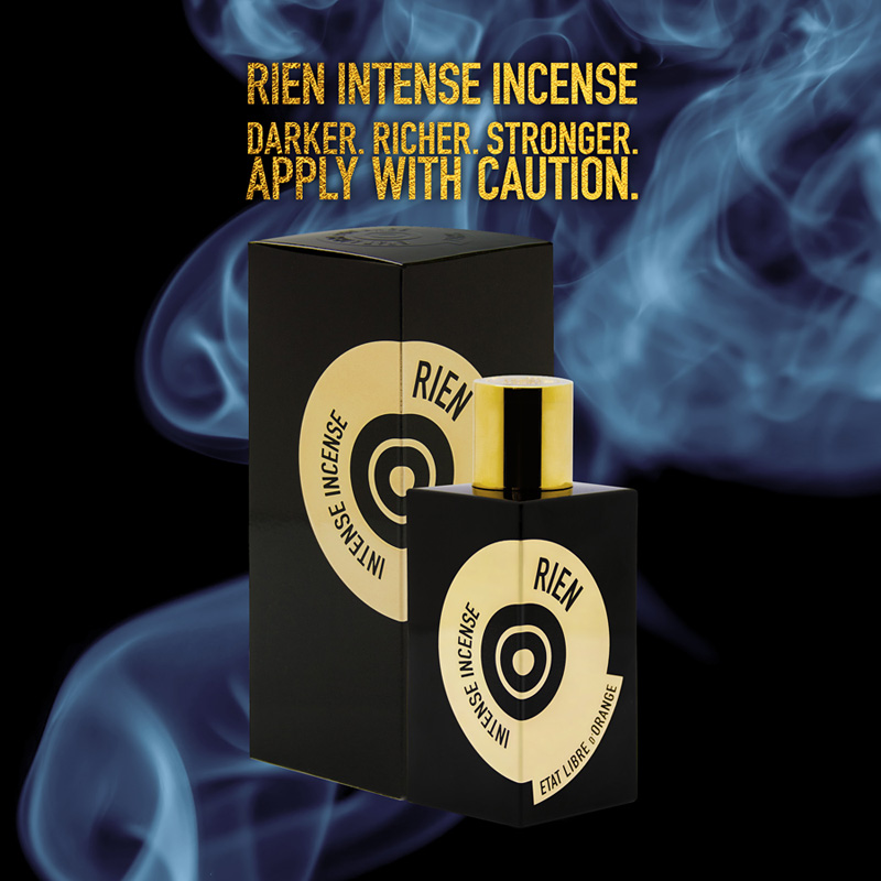 Jakież było moje zaskoczenie, gdy niedawno pojawił się news o nowej premierze – Rien Intense Incense! Pikanterii całości dodawały wyraziste materiały reklamowe obwieszczające m.in., że „Oud jest passe. Przyszłością jest kadzidło.” (podoba mi się!), oraz że mamy przygotować się na „ciemniej, intensywniej, mocniej”, a także by „aplikować z rozwagą”. Wow. Znając „zwykłą” wersję Rien byłem gotów na olfaktoryczne trzęsienie ziemi połączone z jednoczesną eksplozją molekularną…